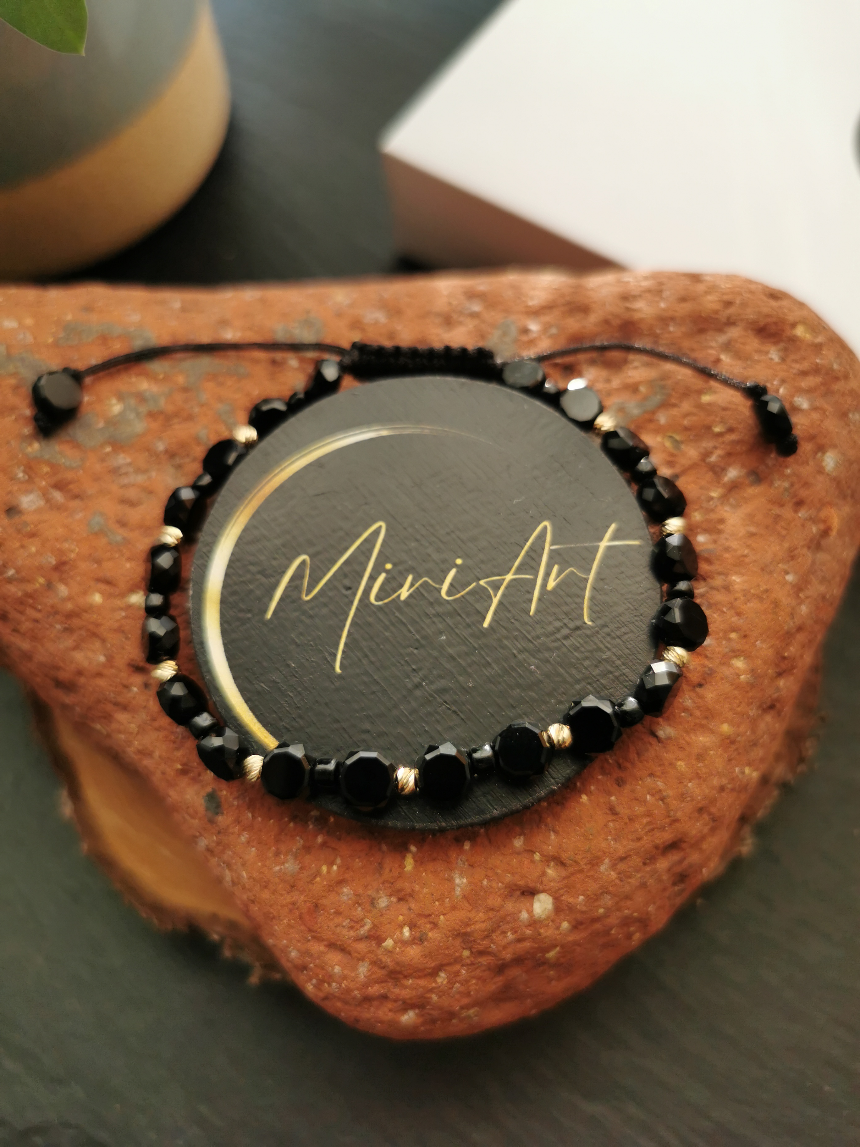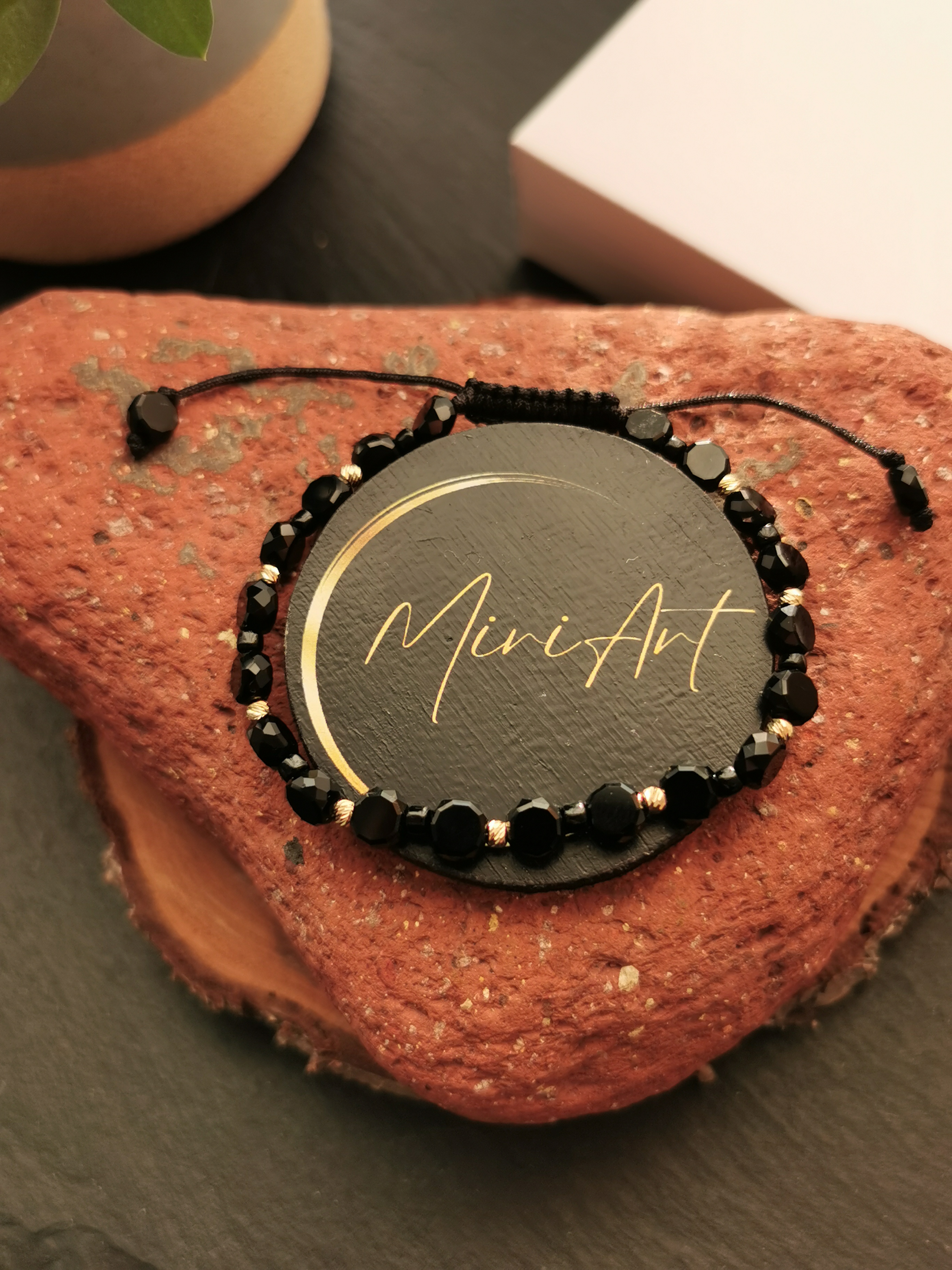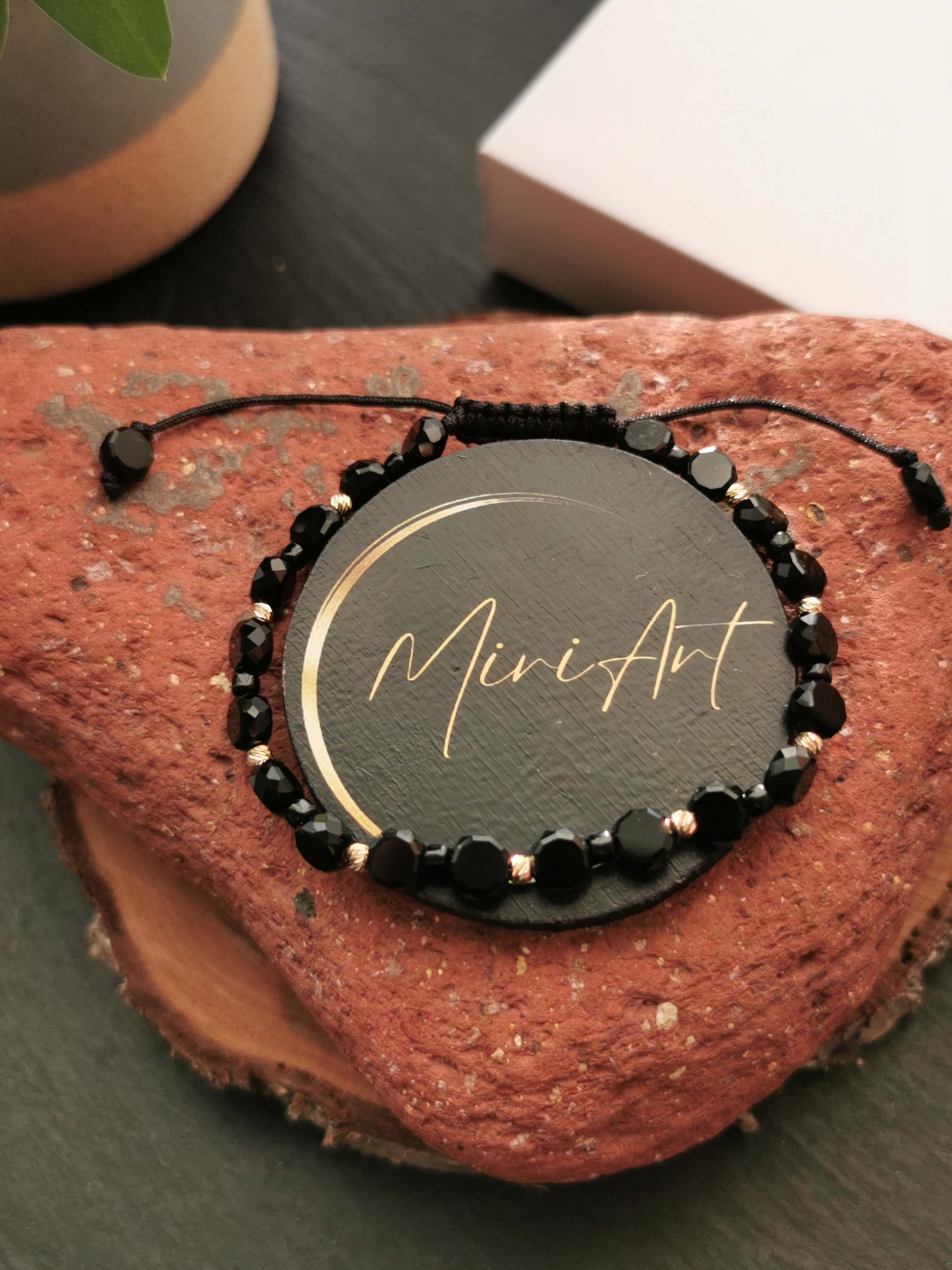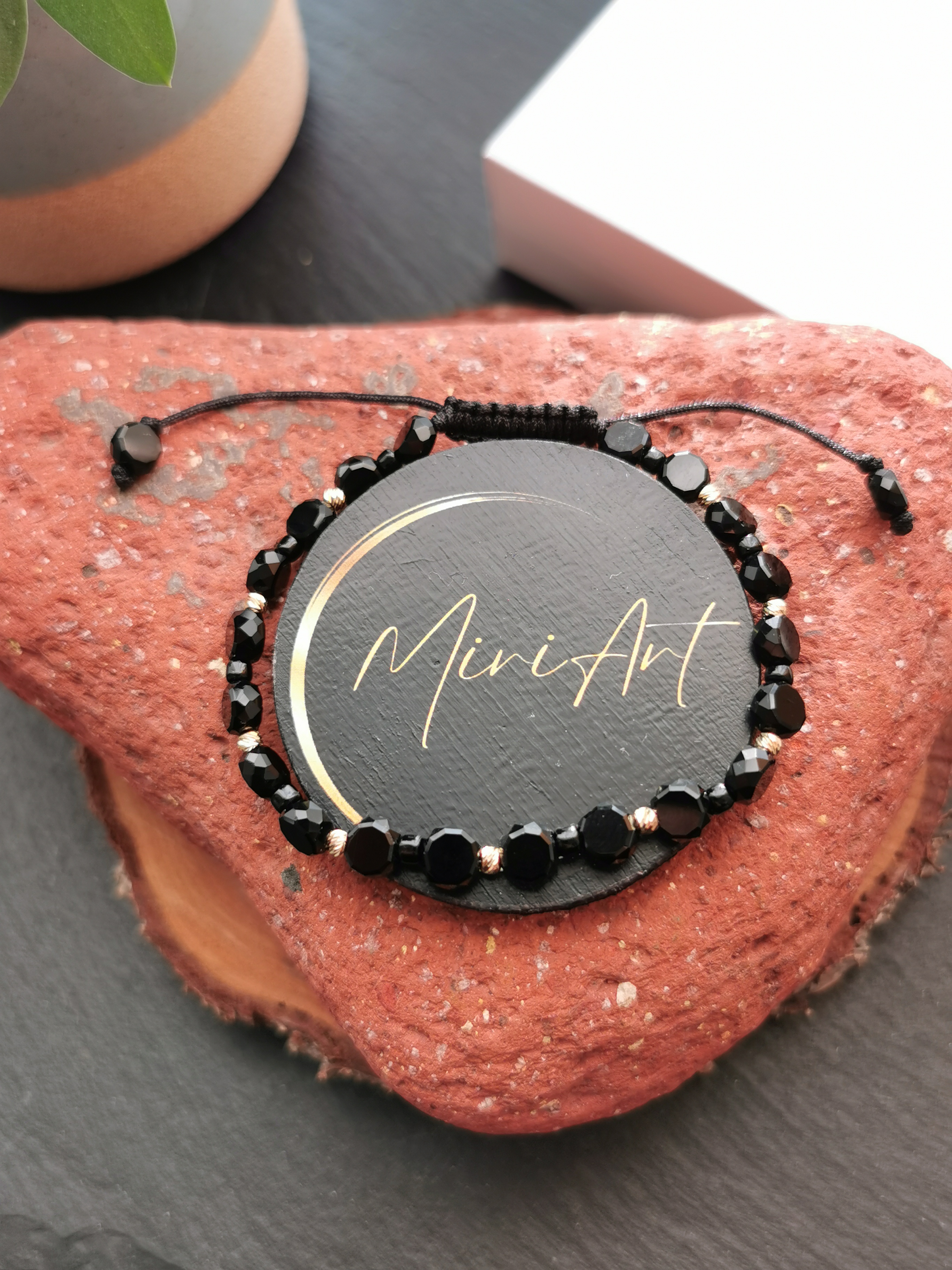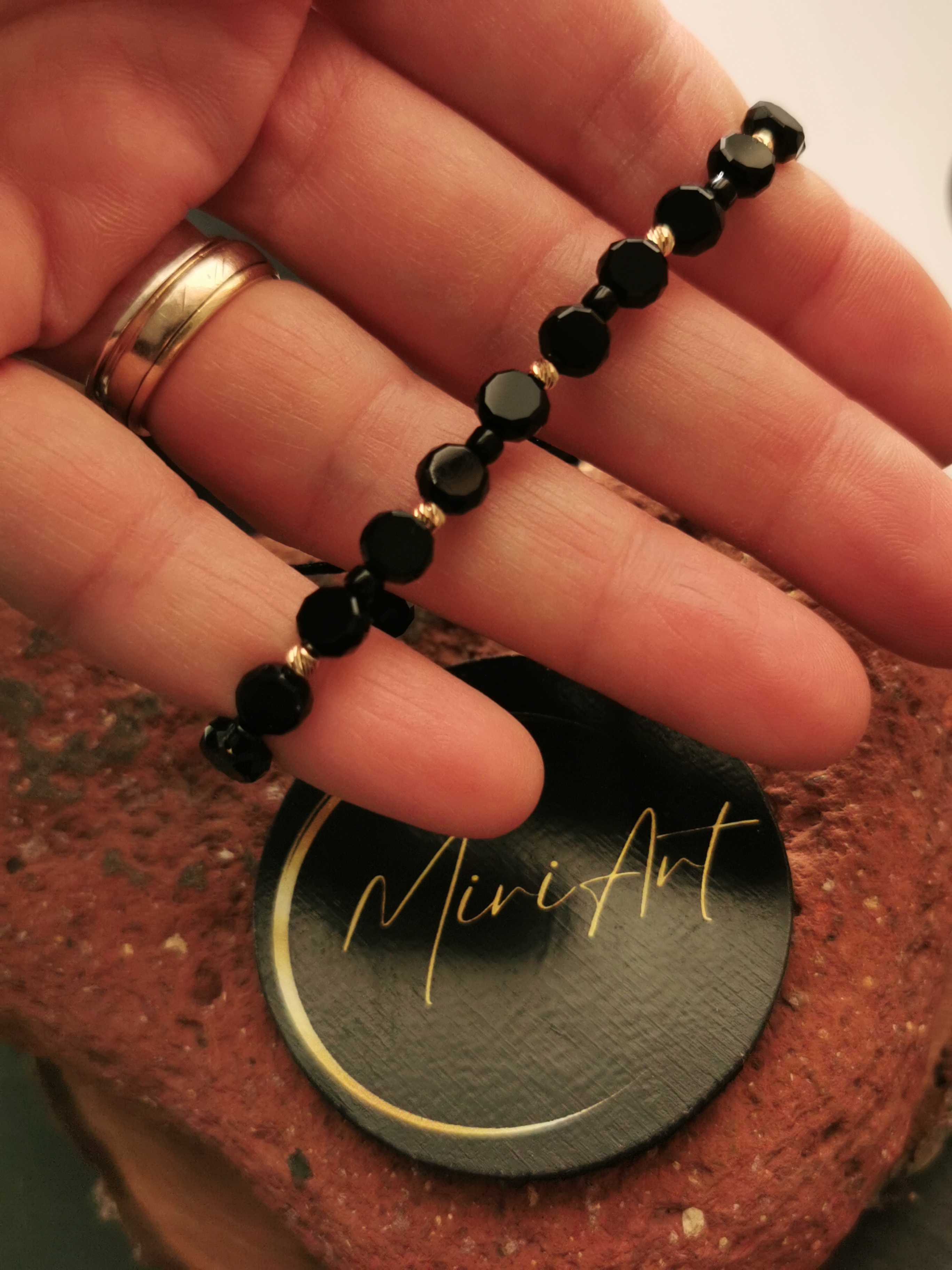 Brățara Esență de Noapte combină cristale negre de sticlă de 4mm cu mărgele Toho delicate, într-un design echilibrat și expresiv.