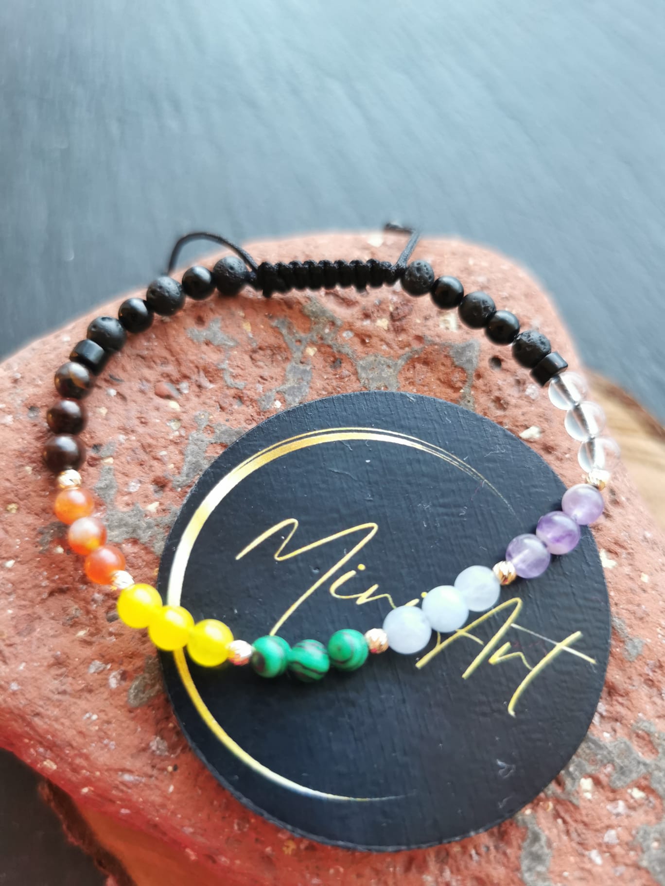Brățara 7 Chakre – Aur și Echilibru este realizată dintr-o selecție de pietre semiprețioase cu rol echilibrant și energizant: Ochi de Taur de 4mm, Carneol de 4mm, Agat de 4mm, Malachit de 4mm, Acvamarin de 4mm, Ametist de 4mm, Cuarț de 4mm, Rocă Vulcanică de 4mm și Onix de 4mm.