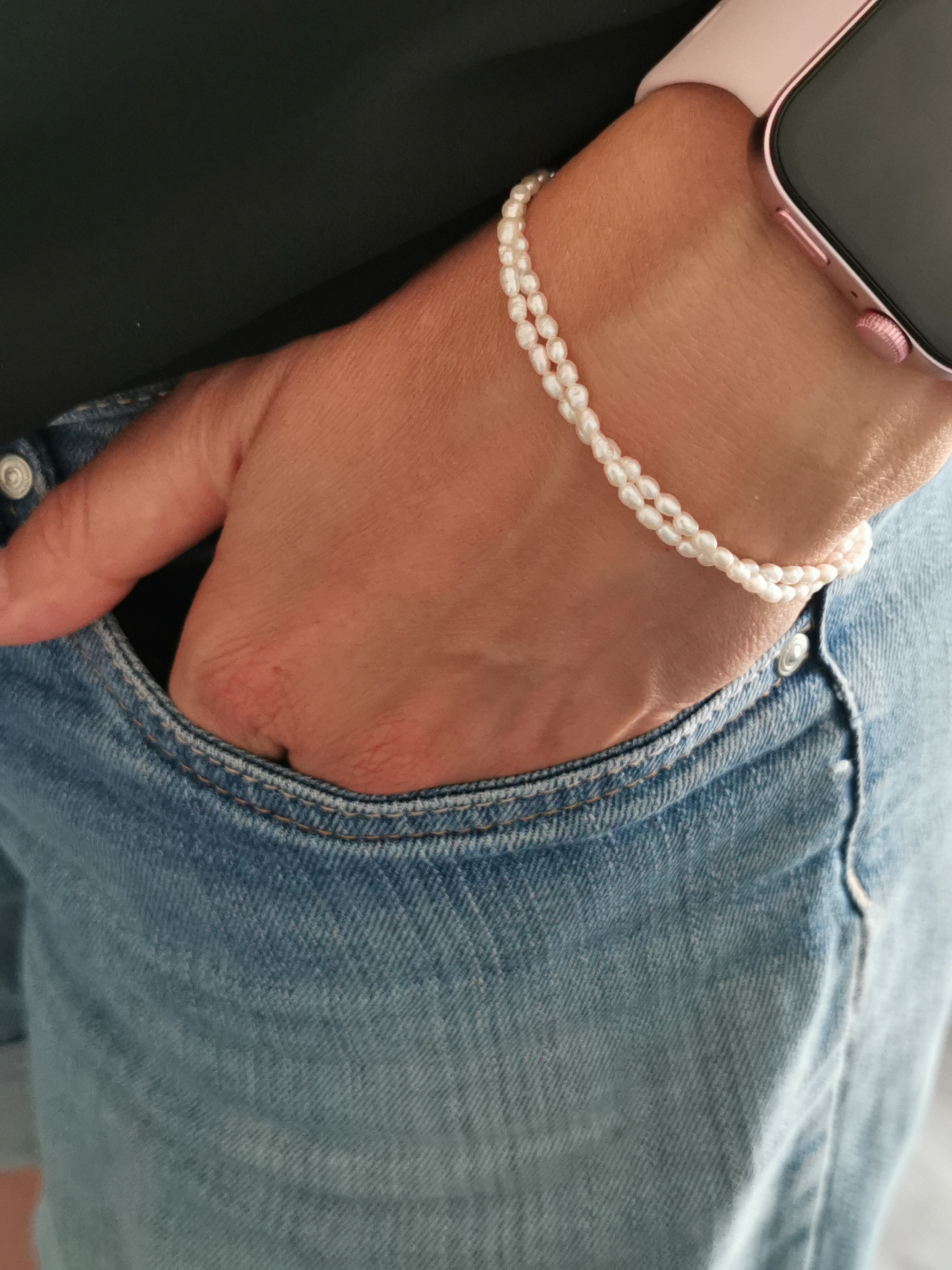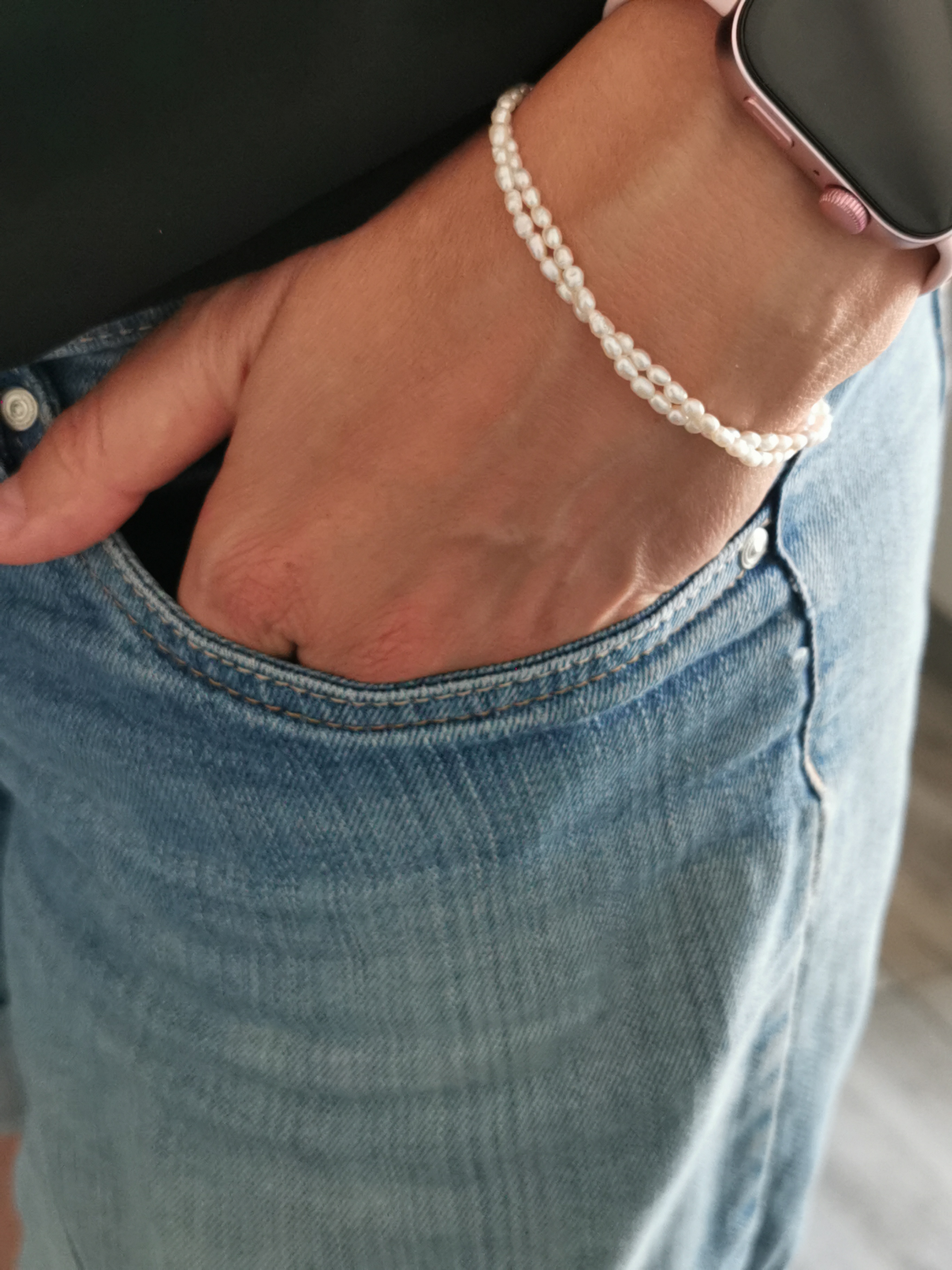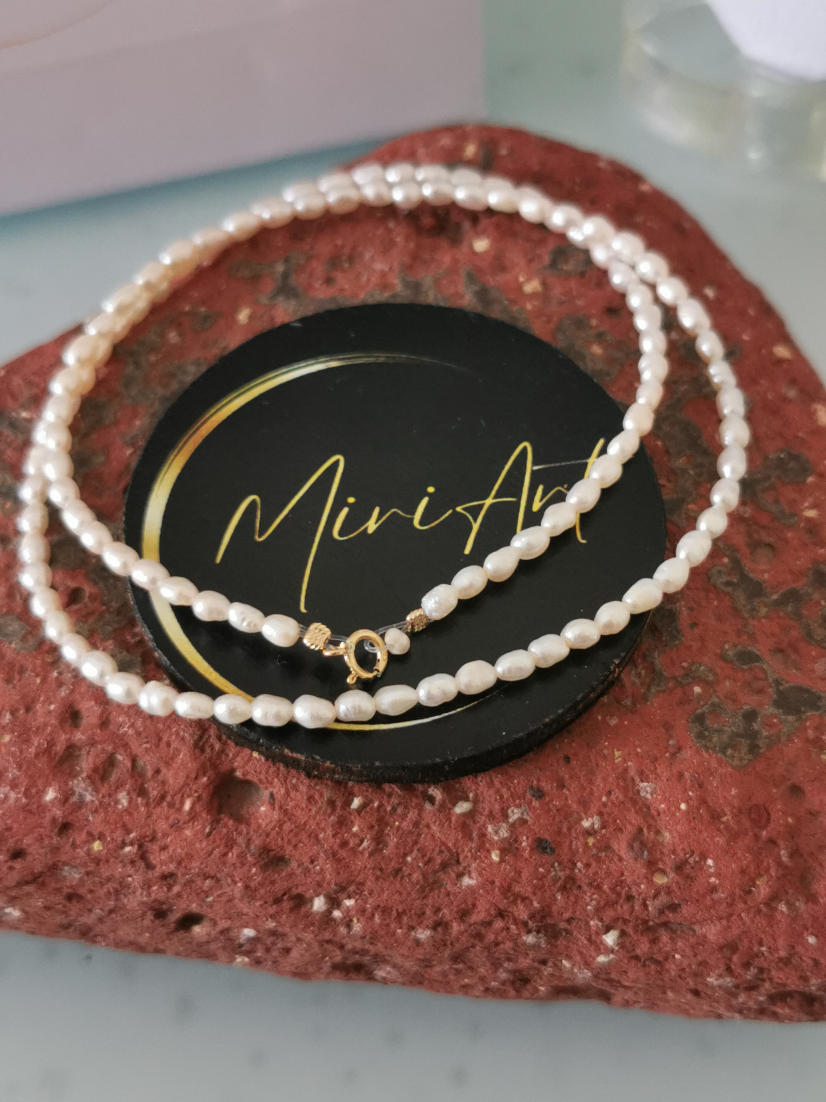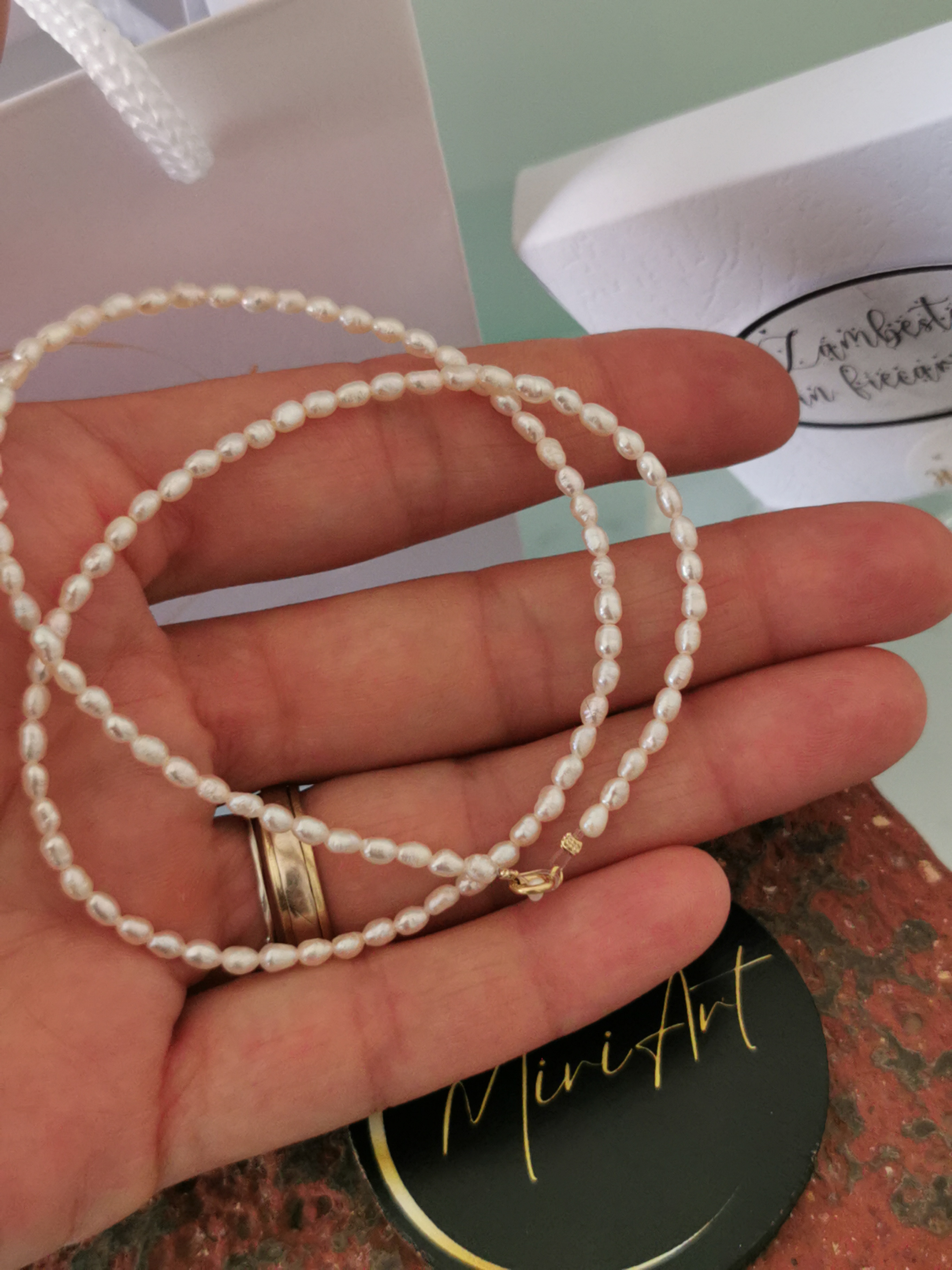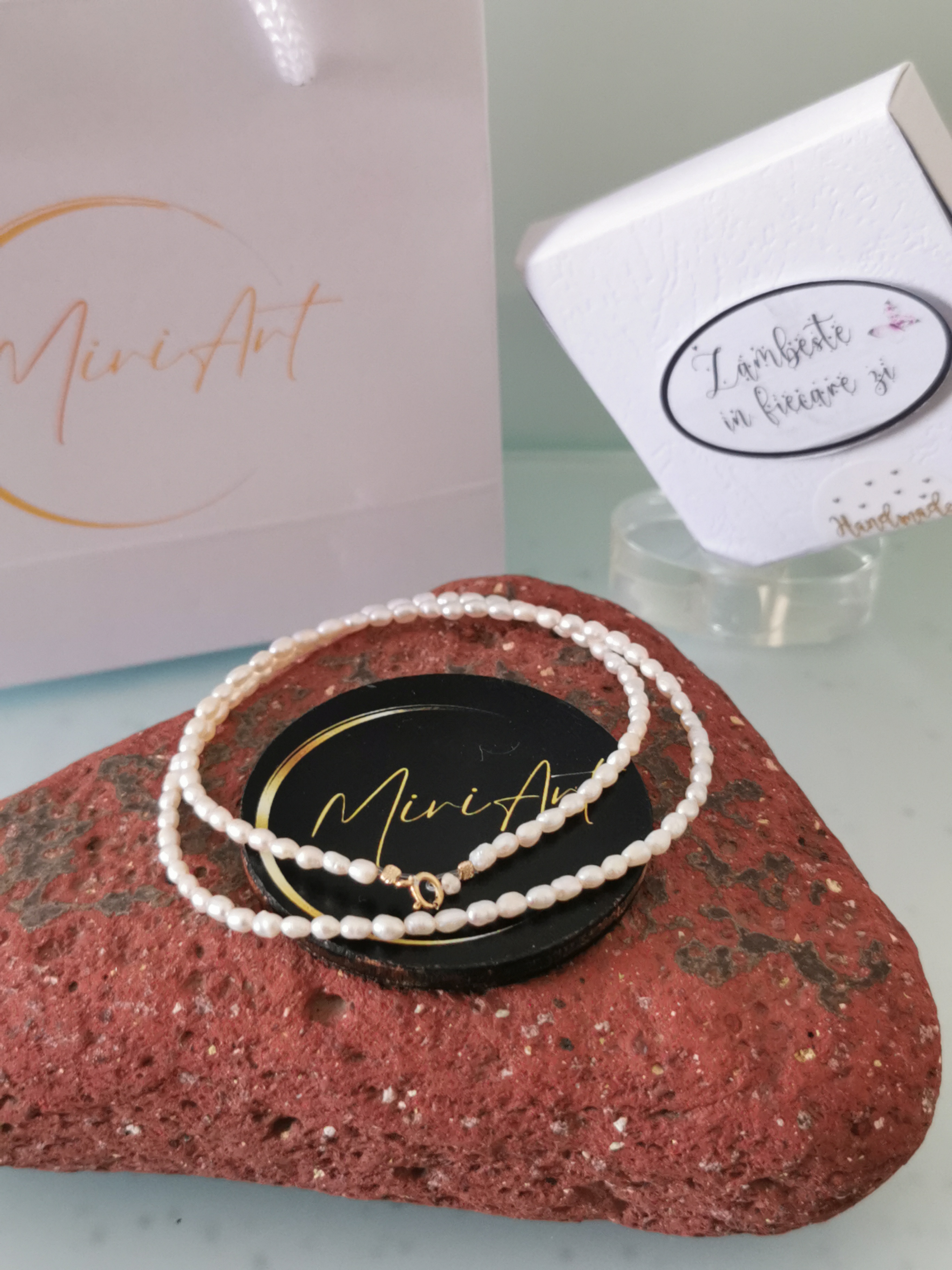 Perlele de cultură 2-2,5mm în nuanțe delicate și dimensiuni variate, aduc un aer clasic și rafinat, în timp ce firul transparent creează impresia unei bijuterii plutitoare, fine și luminoase.
