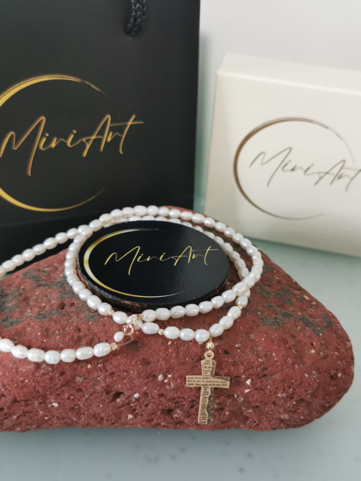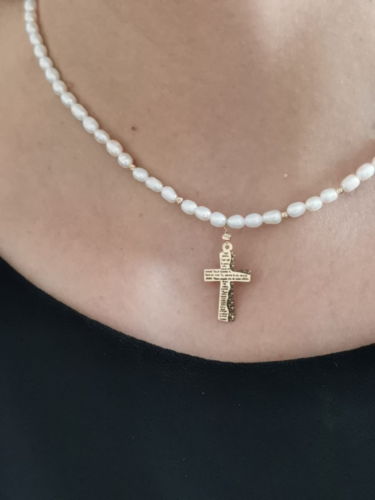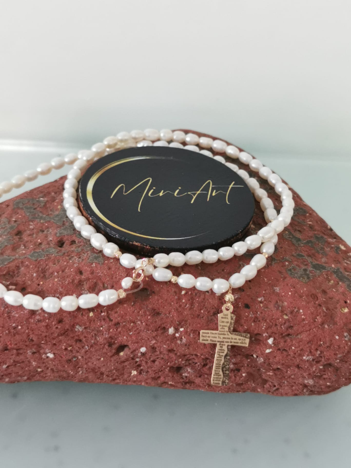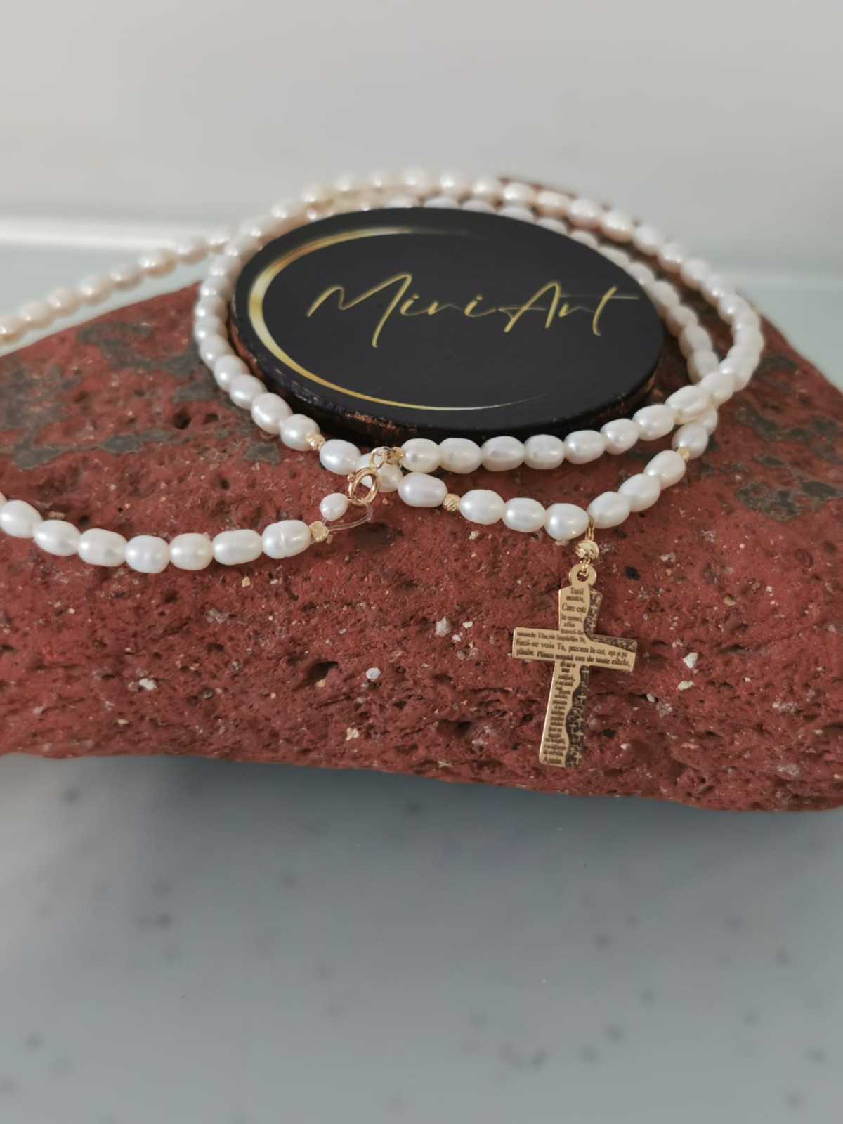 Perlele de cultură bob de orez de 2,5–4 mm delicate adaugă luminozitate și rafinament, iar pandantivul cruce din aur 14K, gravat cu rugăciunea Tatăl Nostru, devine centrul spiritual al bijuteriei.