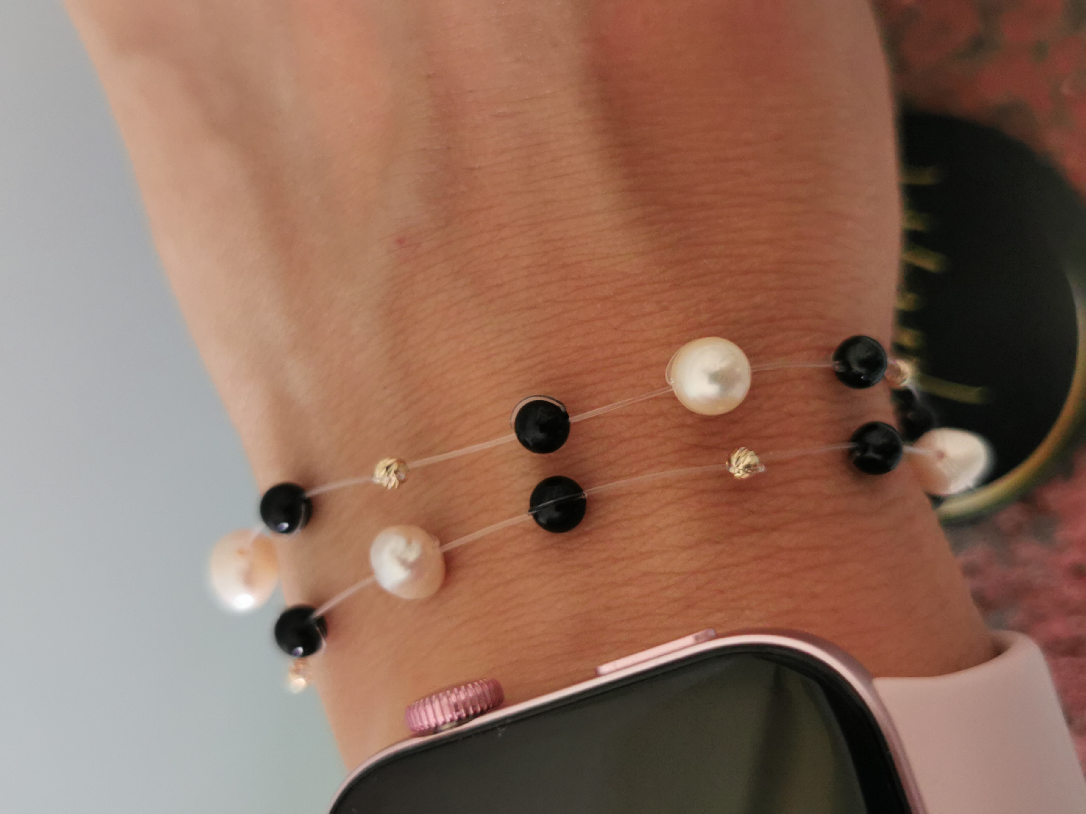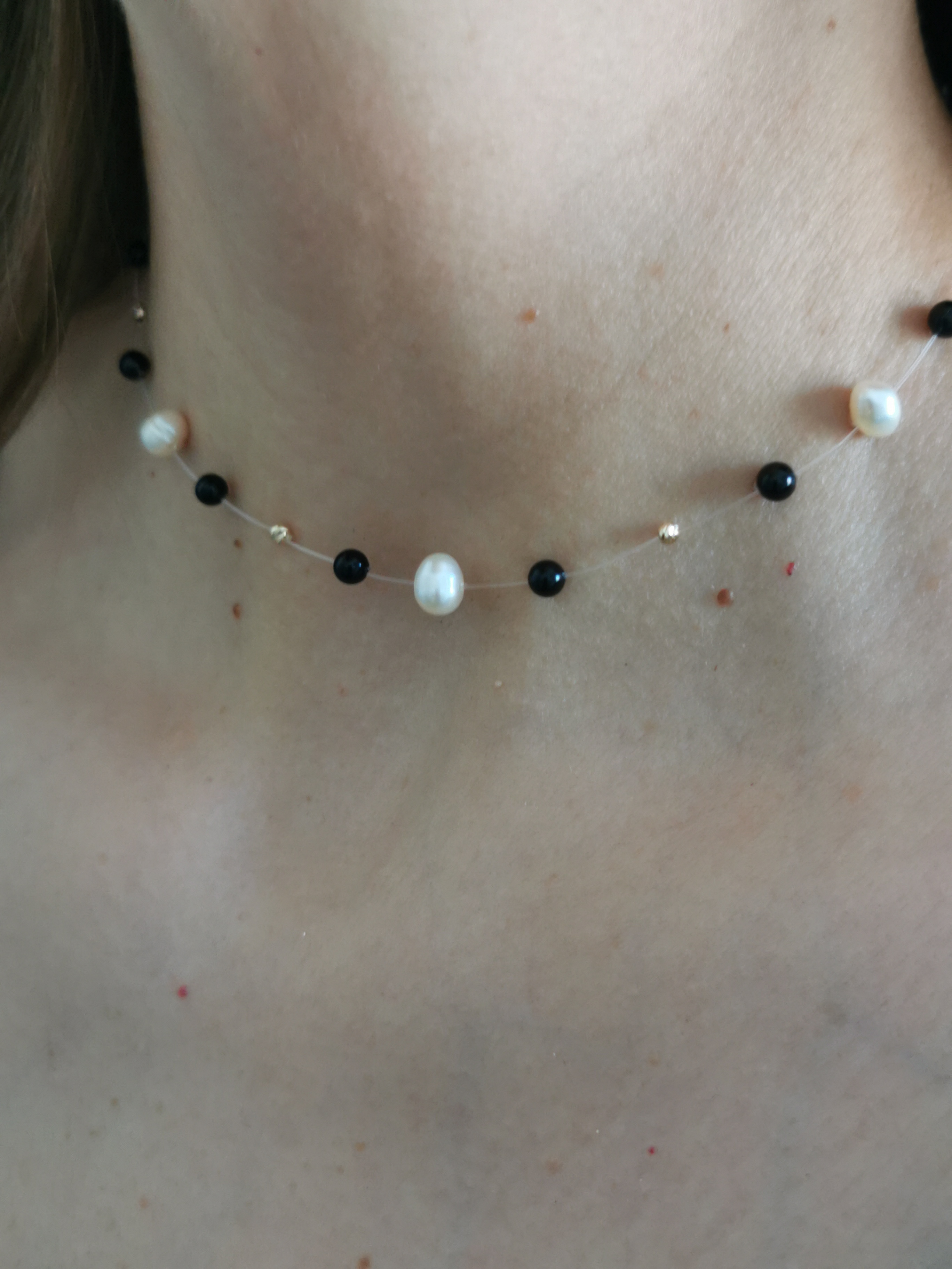 Perlele de cultură de 5-7mm, montate pe fir transparent, au forme ușor asimetrice care accentuează autenticitatea și rafinamentul compoziției.