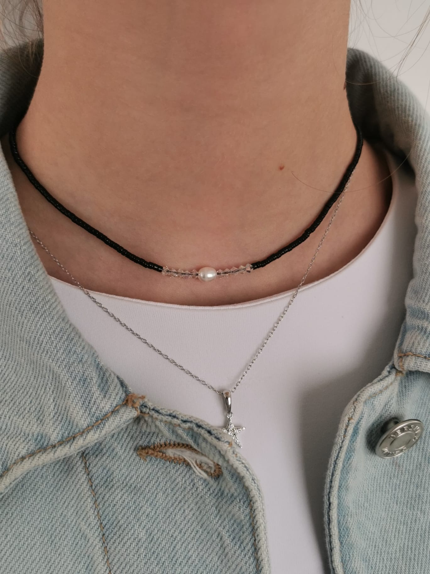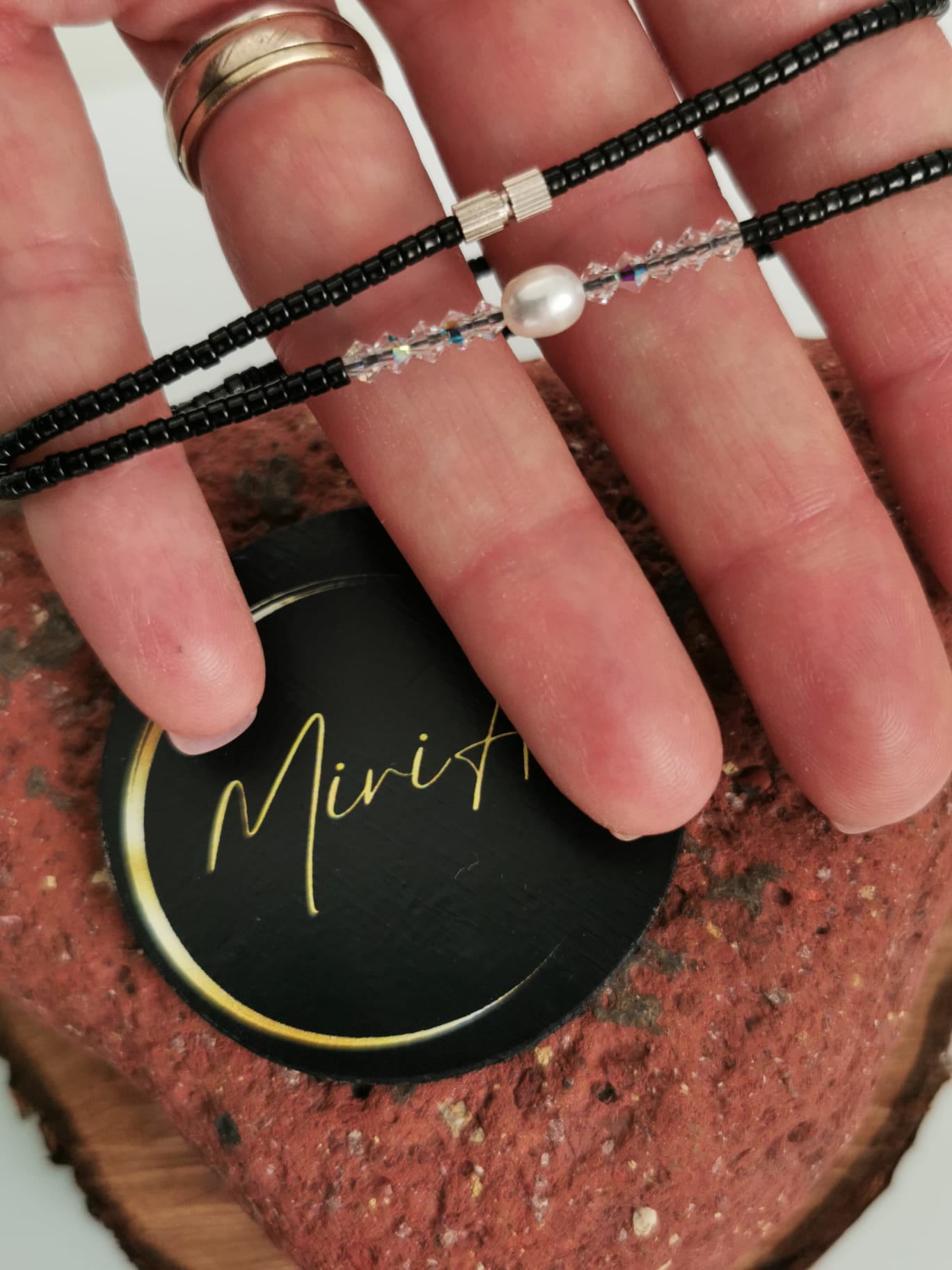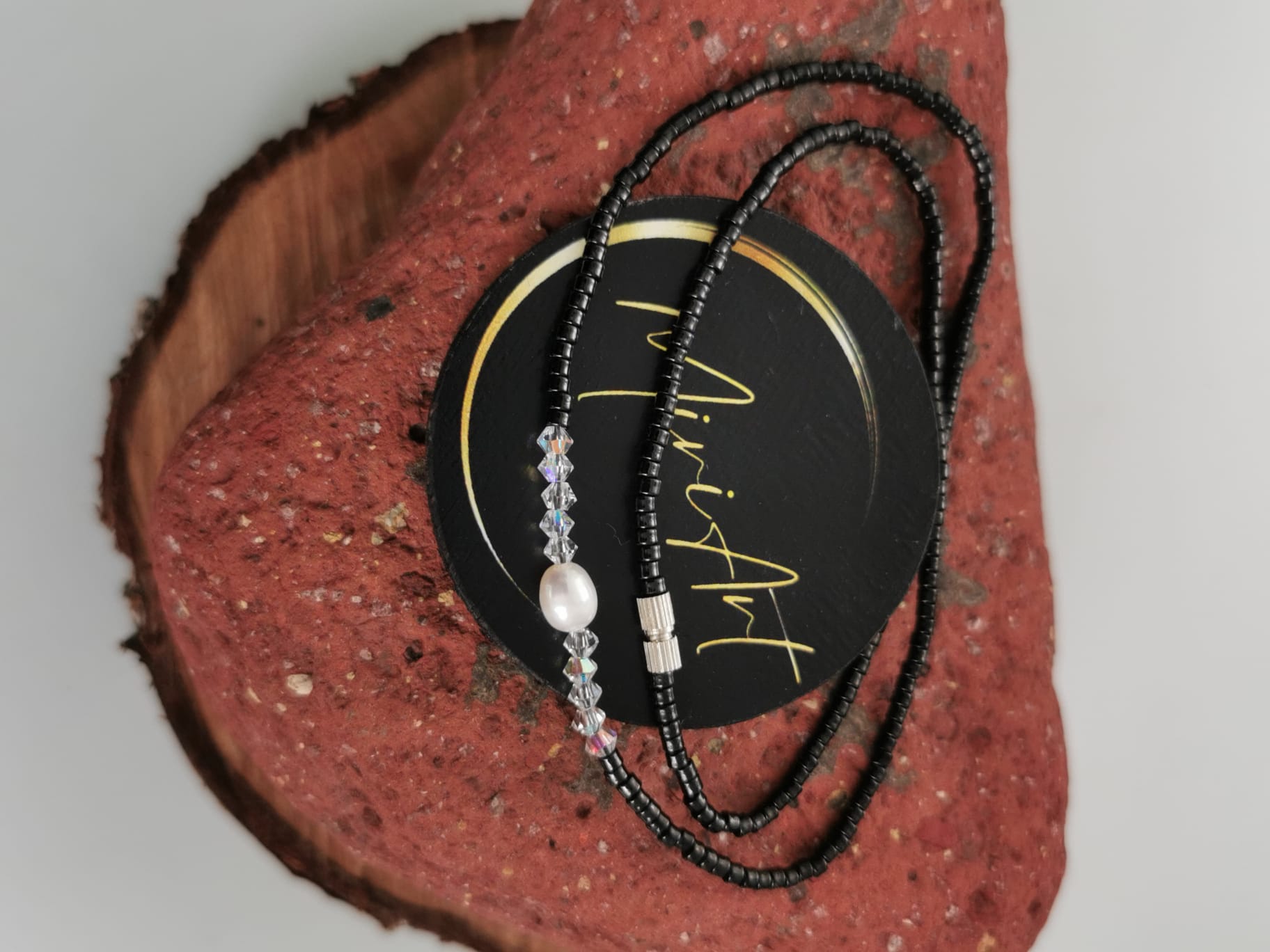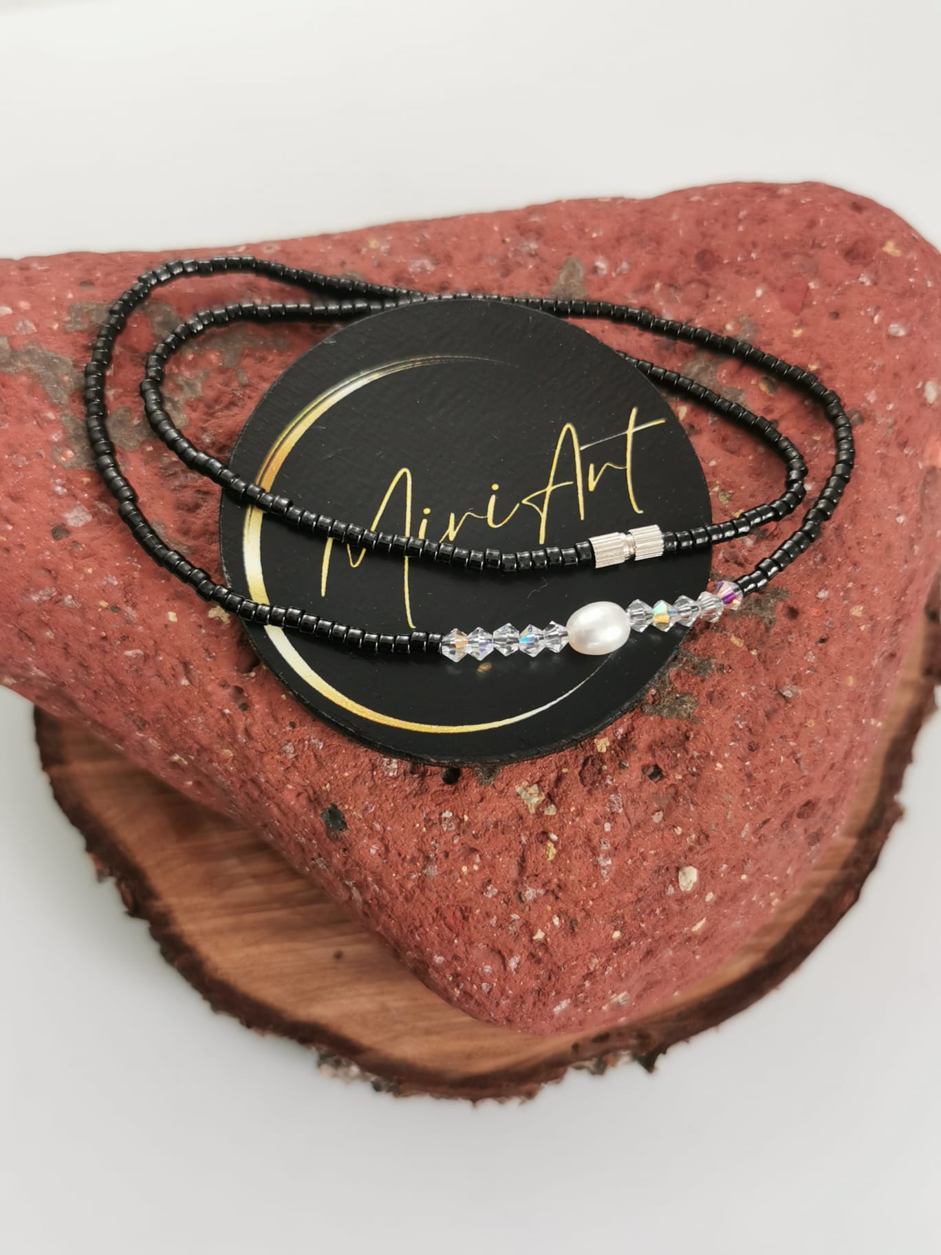 Designul combină eleganța unei Perle de Cultură de 6mm cu strălucirea subtilă a cristalelor de sticlă de 3mm și delicatețea mărgelelor Miyuki Delica de 2mm, recunoscute pentru precizia și frumusețea lor.