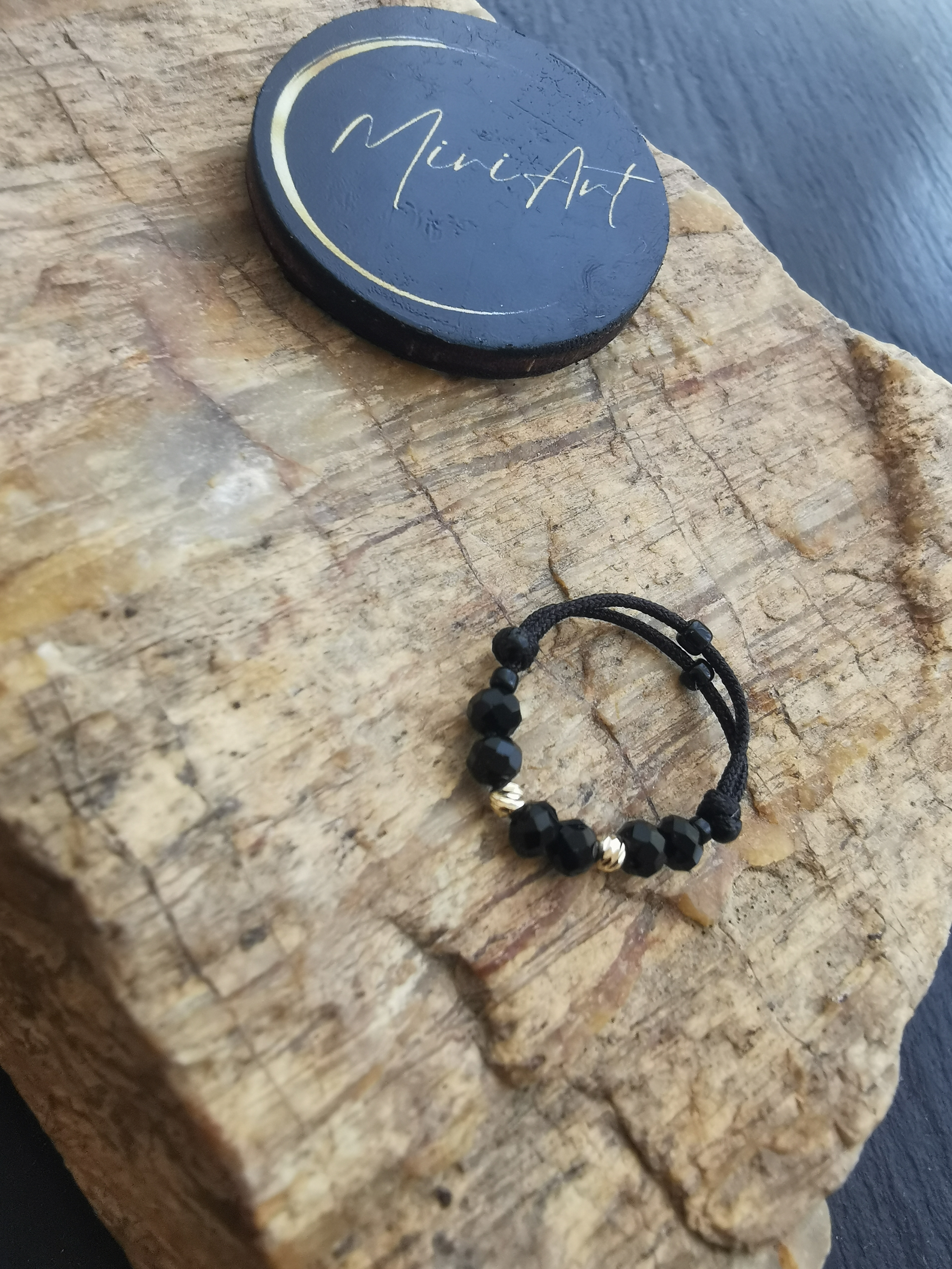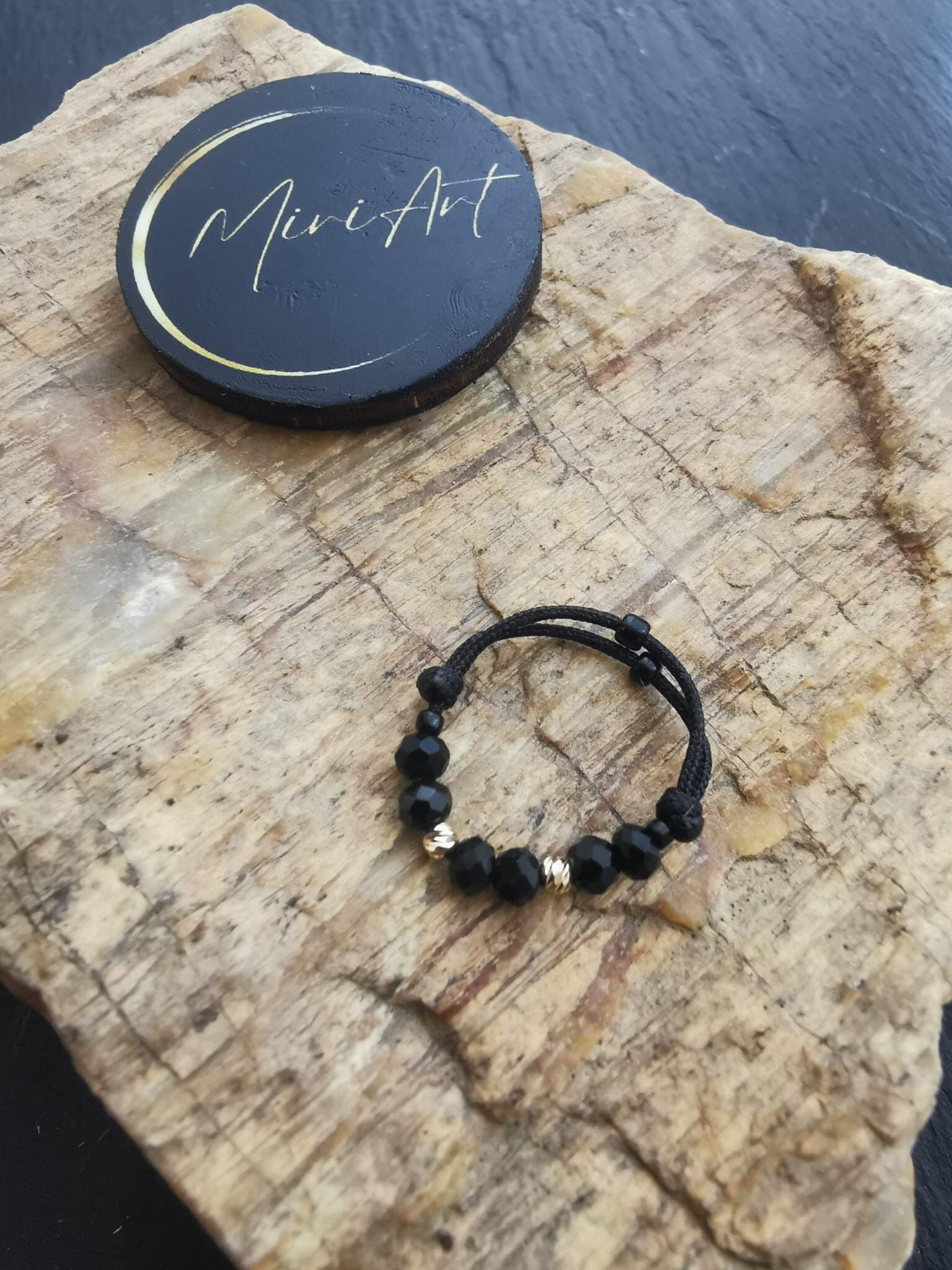 Inel handmade cu 2 sfere de 2mm aur 14k, cristale de sticlă și închidere reglabilă cu noduri.